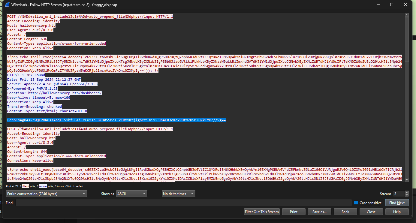 5. Uncovering Encoded Data: Further investigation reveals POST requests containing PHP shell code running PowerShell, which seems to be encoding data in base64.