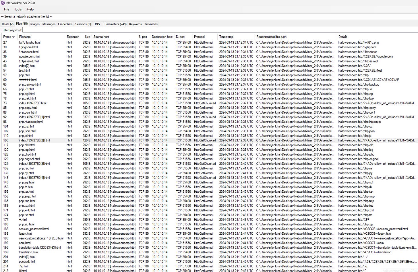2. Initial Exploration with NetworkMiner: Switching to NetworkMiner, we analyze the PCAP. There are **2 hosts, 60 files, and 5 sessions**—and a lot of PHP traffic stands out. Among the traffic, some files appear related to passwords. Suspicious!