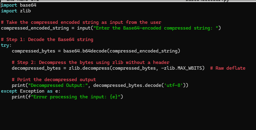 6. Decoding the Obfuscation: The responses include compressed base64 strings. To decode this, we need a Python script capable of decompressing and converting this base64 data into readable text.