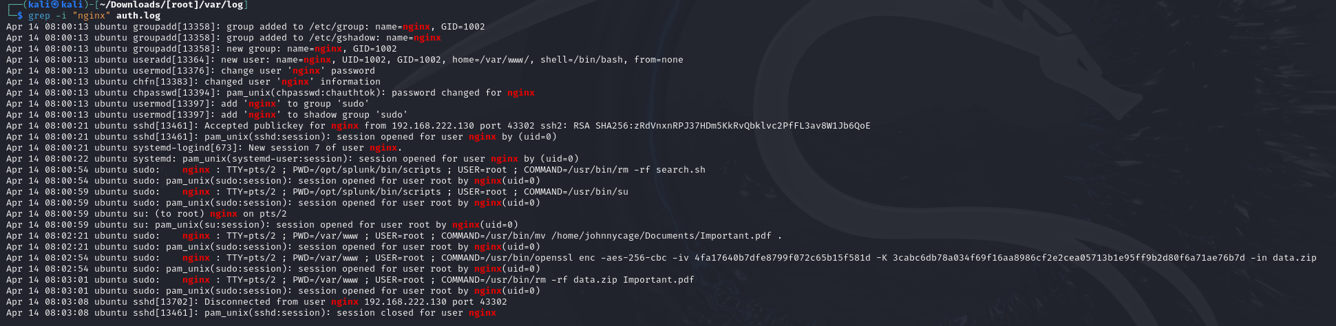 - Look in auth.log: The attacker moves Important.pdf (zipped as `data.zip`) over the network via TCP port 8080.