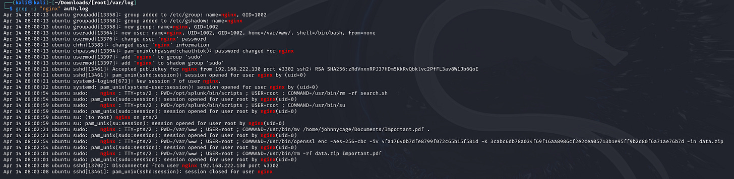 - Key Finding: The `search.xsl` file shows the attacker creating a user with SSH access.
