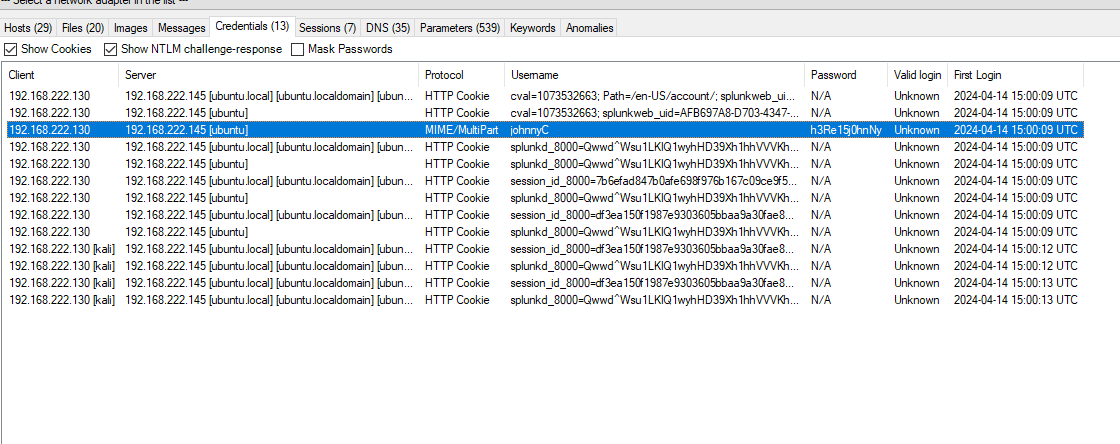 - NetworkMiner: Open the pcap in NetworkMiner and navigate to the credentials tab to see the username and password the attacker used to access Splunk.