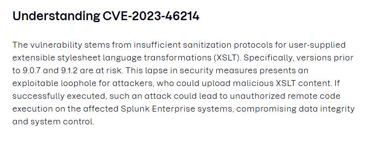 - Research: Search for "XSL injection Splunk", which points to an XSL RCE CVE. This vulnerability allows an attacker to exploit the XSLT (Extensible Stylesheet Language Transformations) parser in Splunk