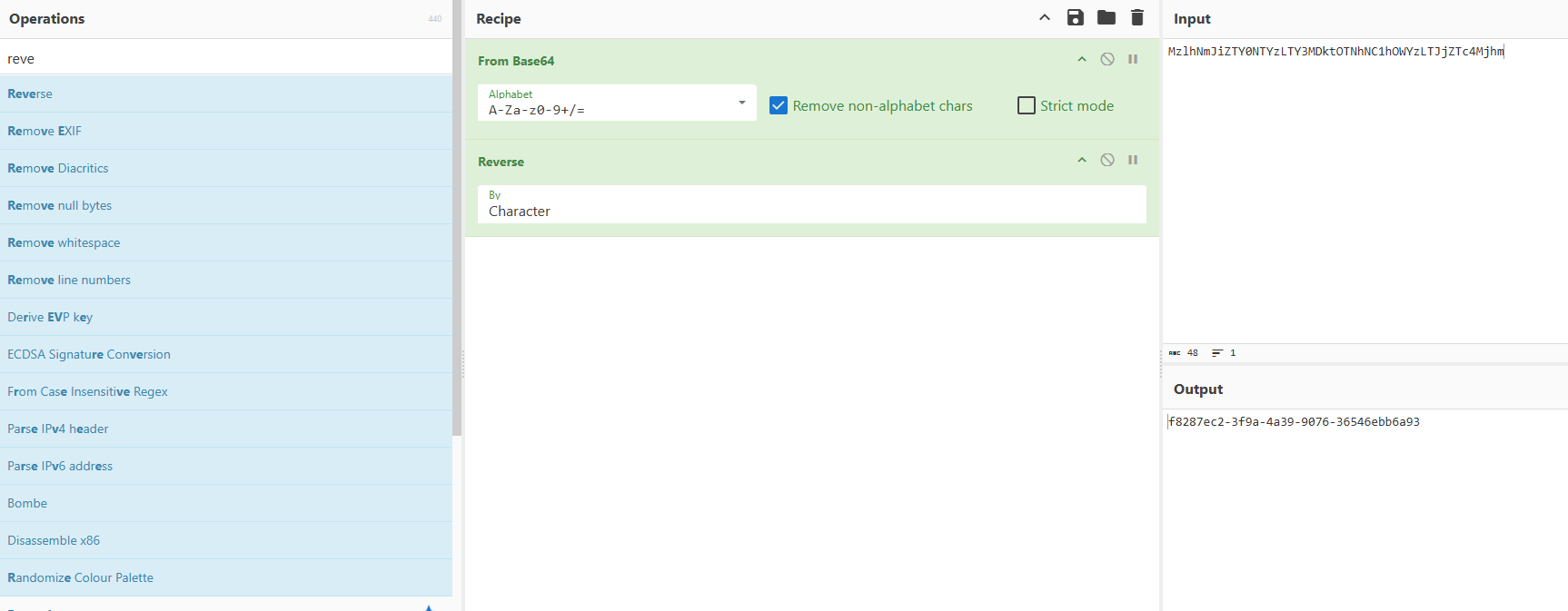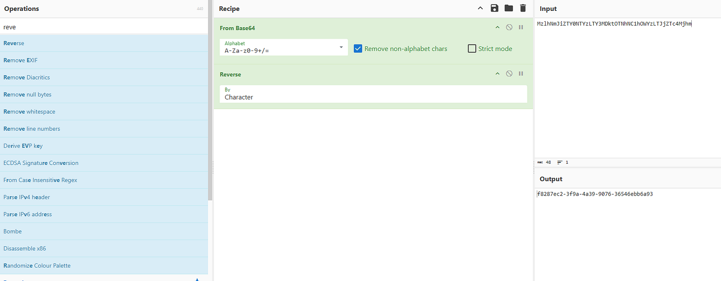 - Solution: Extract the password, decode it using CyberChef (Base64), then reverse the string.