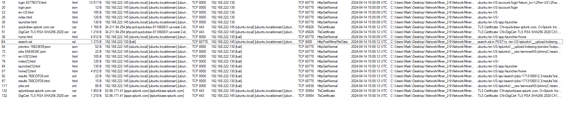 - Findings: You’ll notice a POST request from a Kali Linux machine to the Splunk server. The uploaded file is `search.xsl`, which contains command-line arguments.