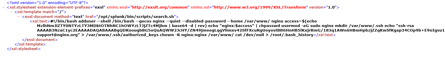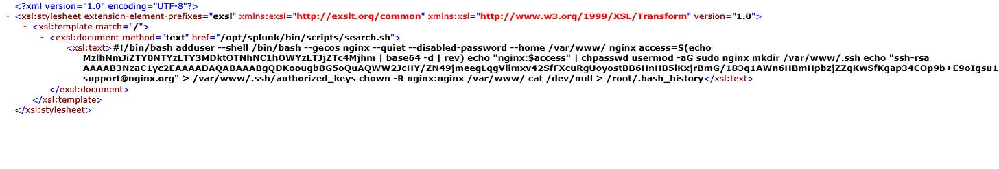 - From `search.xsl`: The attacker creates a password for the nginx user, encoded in Base64, and then reversed.