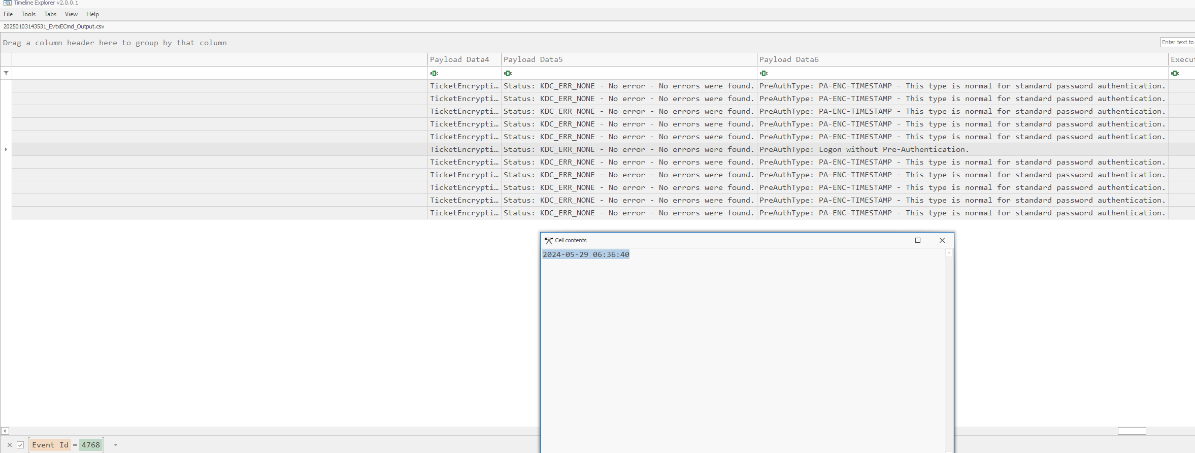 Check the Payload Data6 column for entries containing "Logon without Pre-Authentication," indicating an ASREP Roasting event.