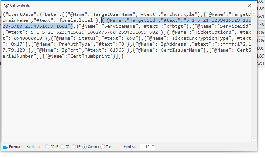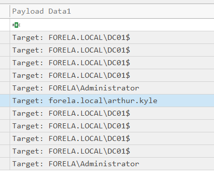 In the same filtered view, locate the TargetSid field within the Payload column to find the Security Identifier (SID) of the account.